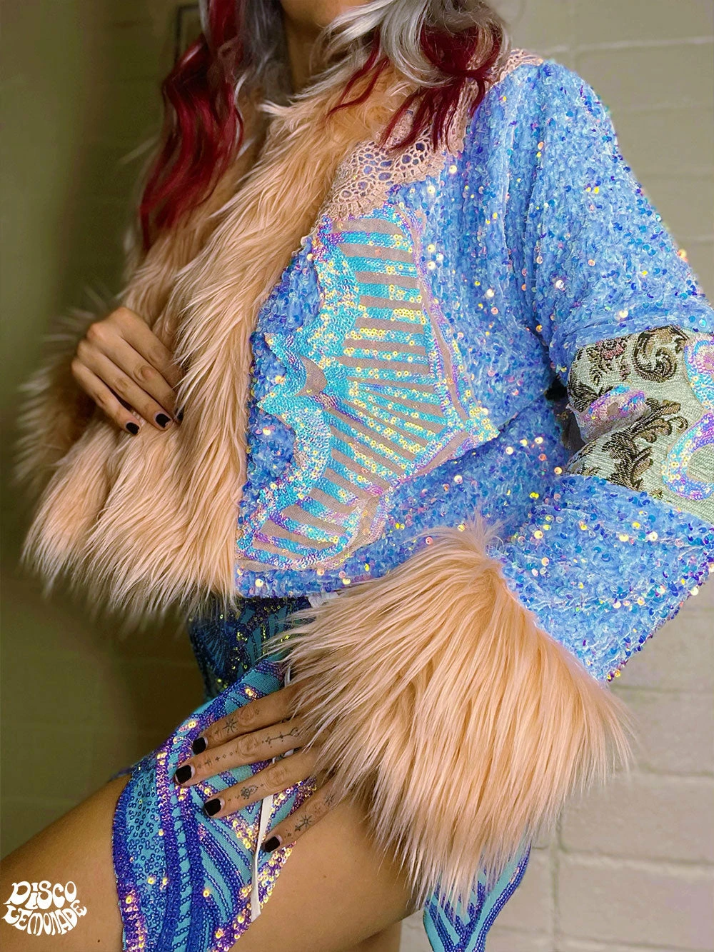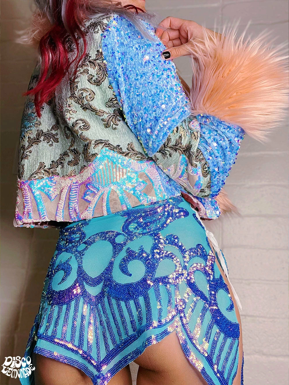 Upholstery crop coat with sequin cut out design and signature baby blue sequin.