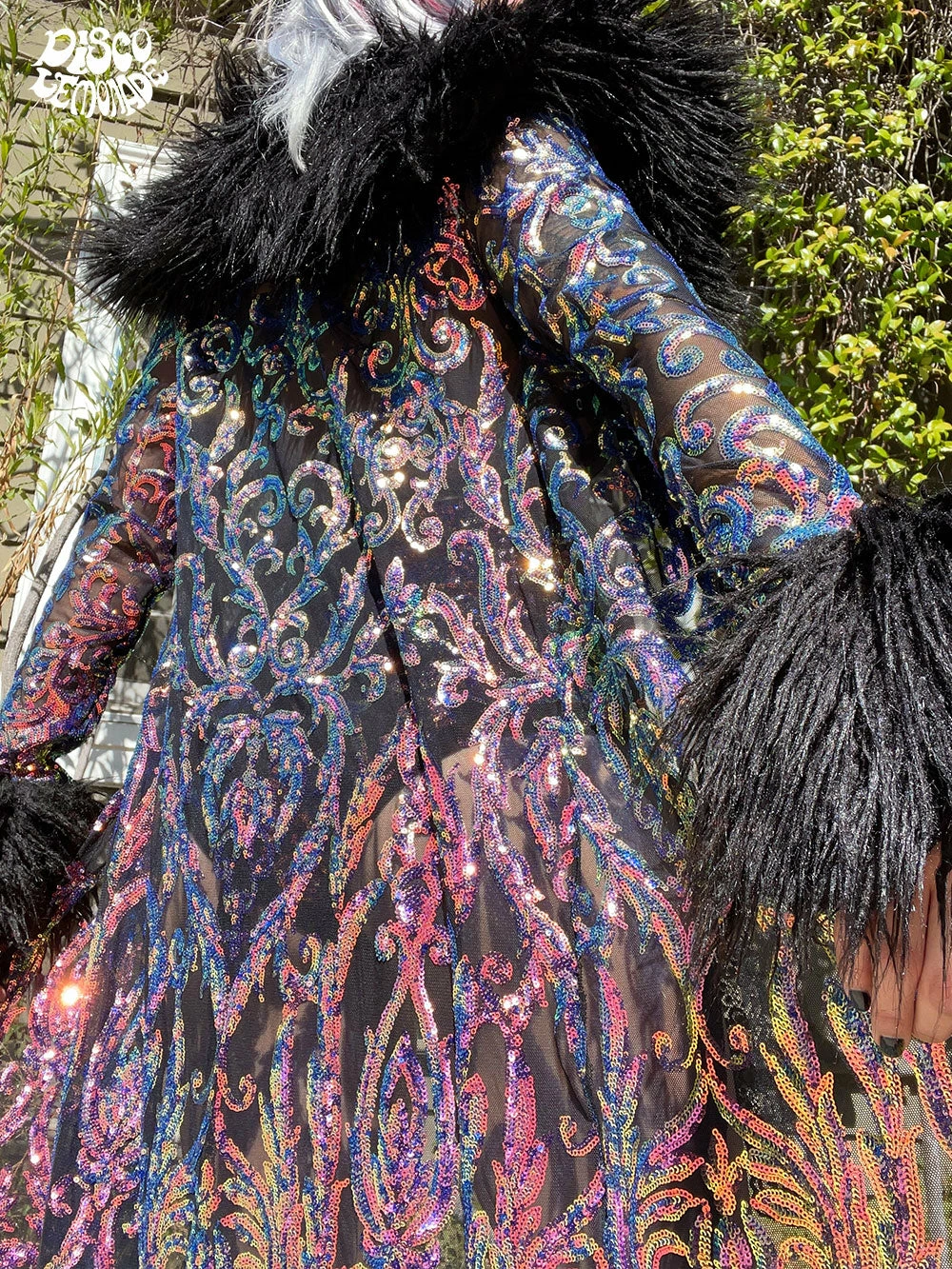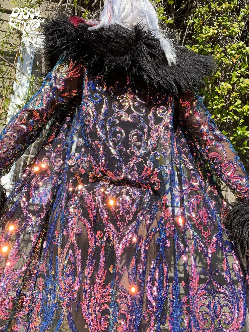 Our seductive sequin floor length duster is a MUST to layer over any cute Disco Lemonade dress, bells or cardigan to spice up your outfit.