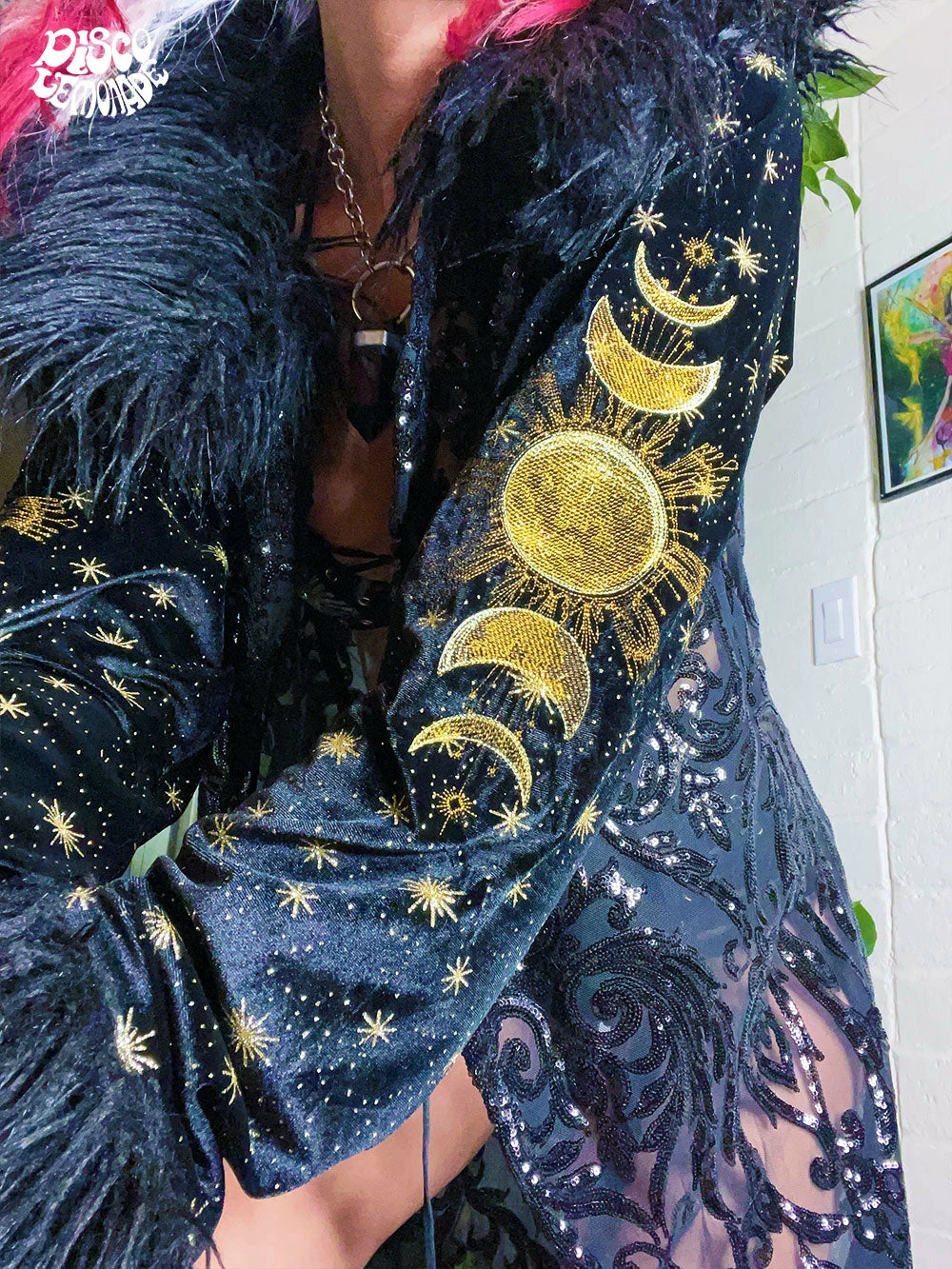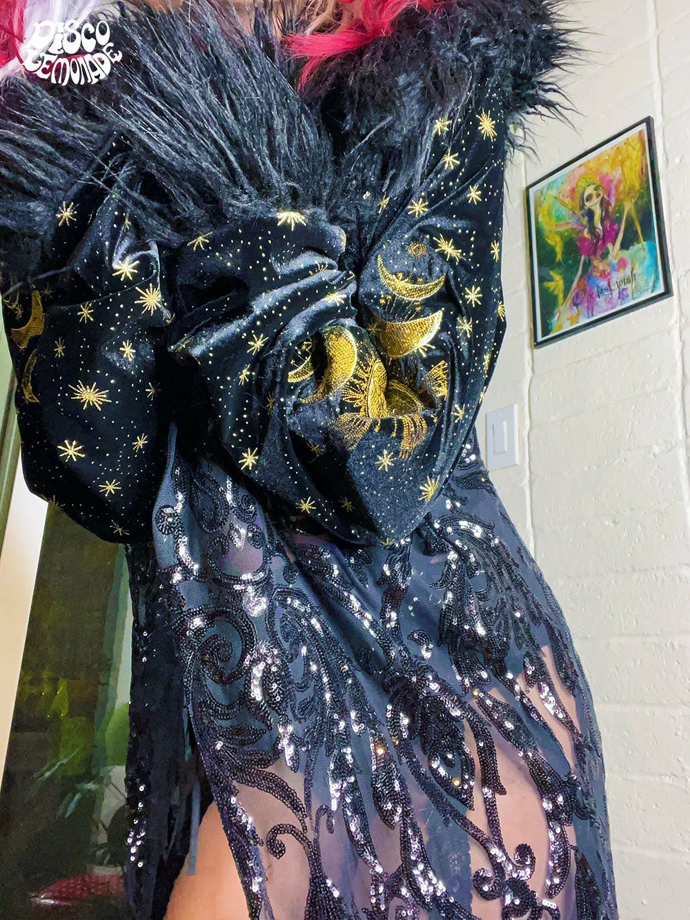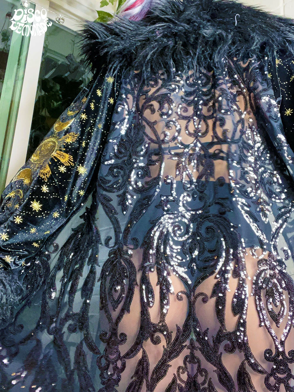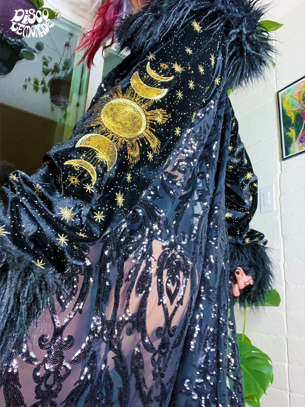 Our seductive sequin floor length duster is a MUST to layer over any cute Disco Lemonade dress, bells or cardigan to spice up your outfit.