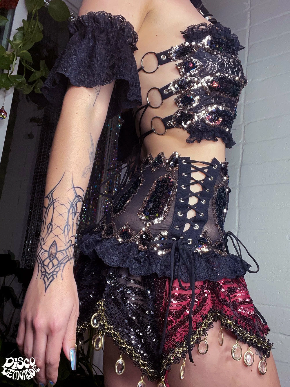 This one of a kind set comes with lace strapless top connected by o rings and embellished with cut out rectangular sequin, ruffle sleeves & ruffle skirt with oval crystal trimming.