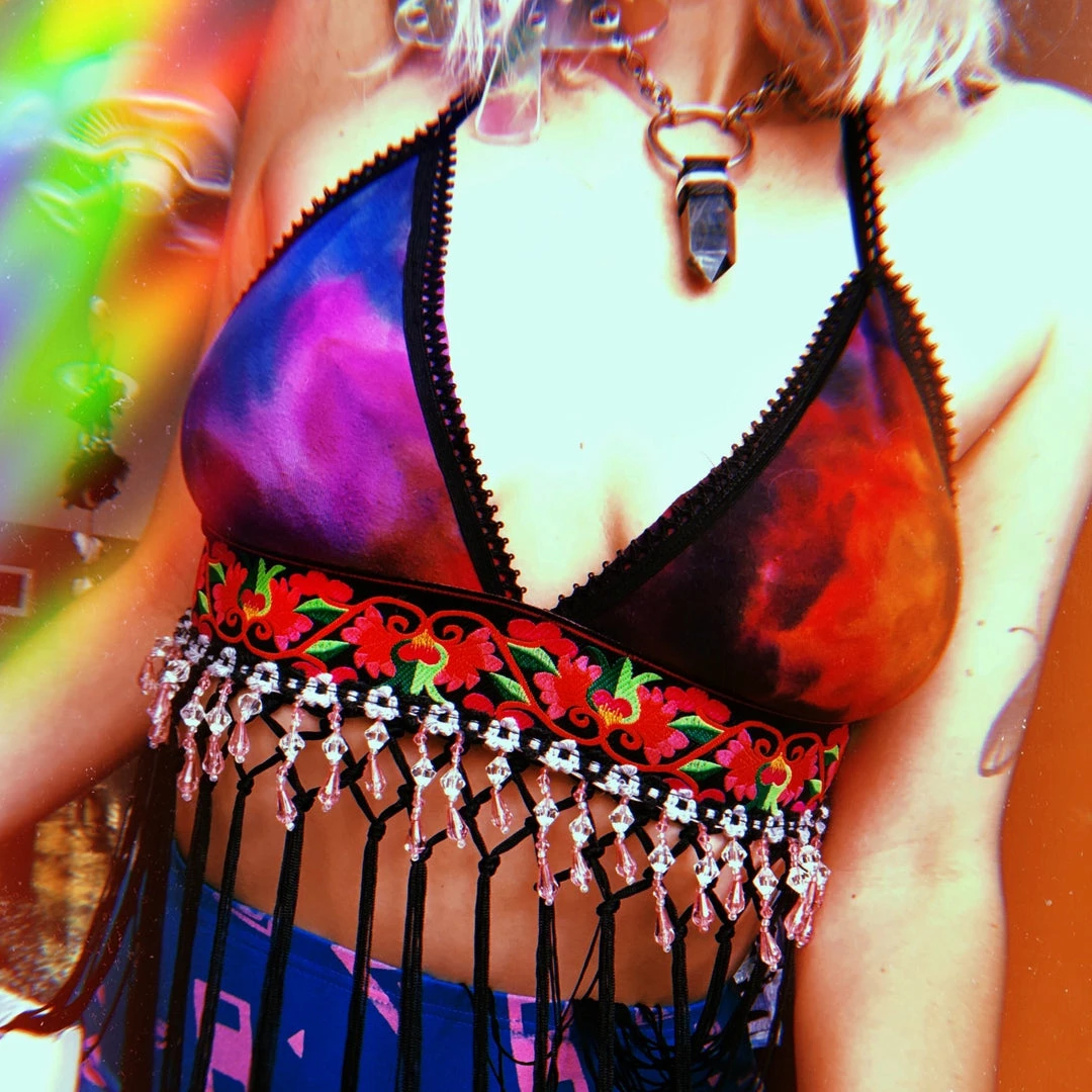 Recycled fabric from angel PSYdye {IG} ~ rainbow tie dye fabric with neon pink & green floral bohemian trim with black & grey floral trimming & pink crystal beading ~ you will be G L O W I N G anywhere & everywhere you go in this colorful piece ~