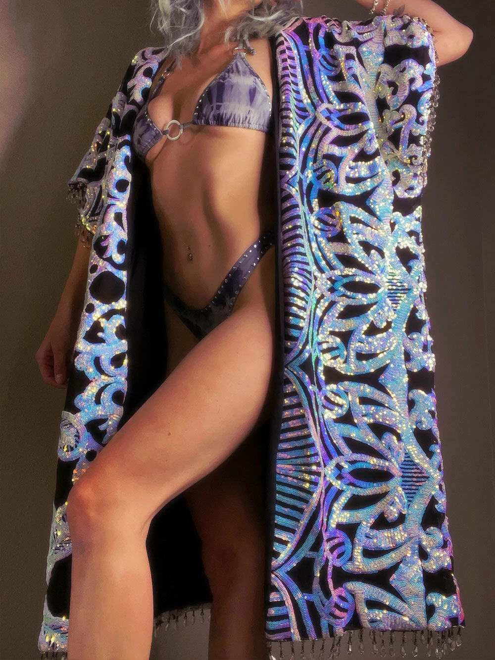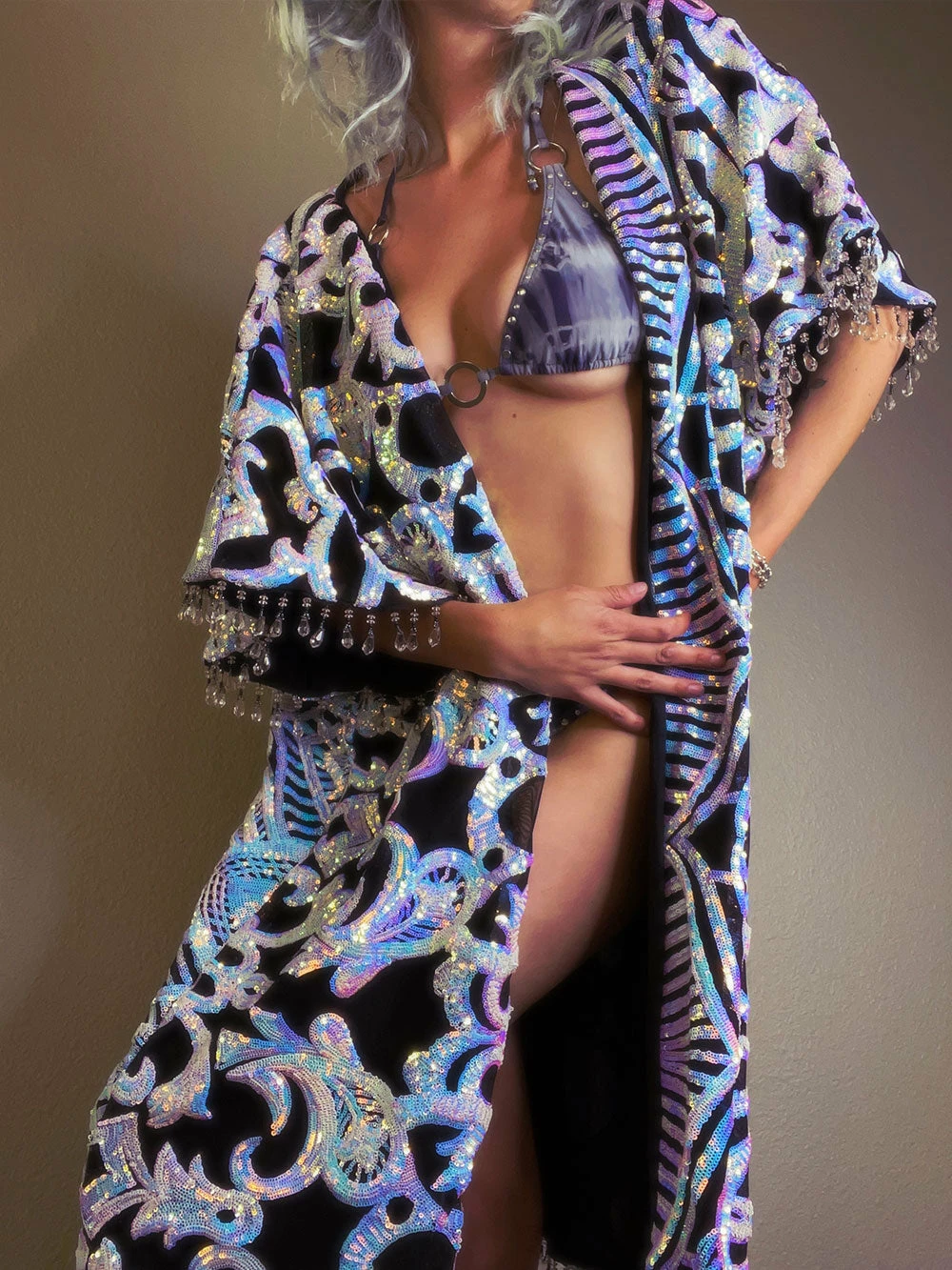 The ultimate layering piece that is as effortless as it is extra. This robe is trimmed with sturdy, high-quality beading for an extra layer of sparkle. It is also completely lined with high quality helenca fabric so there are absolutely no sequin scratchies!