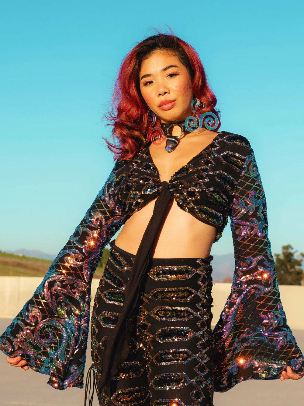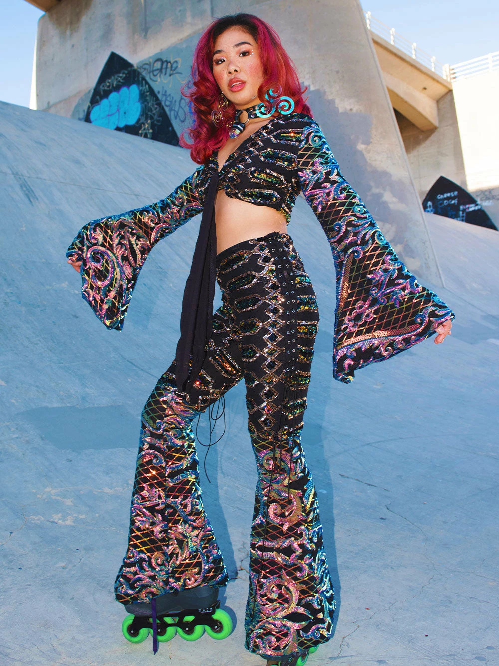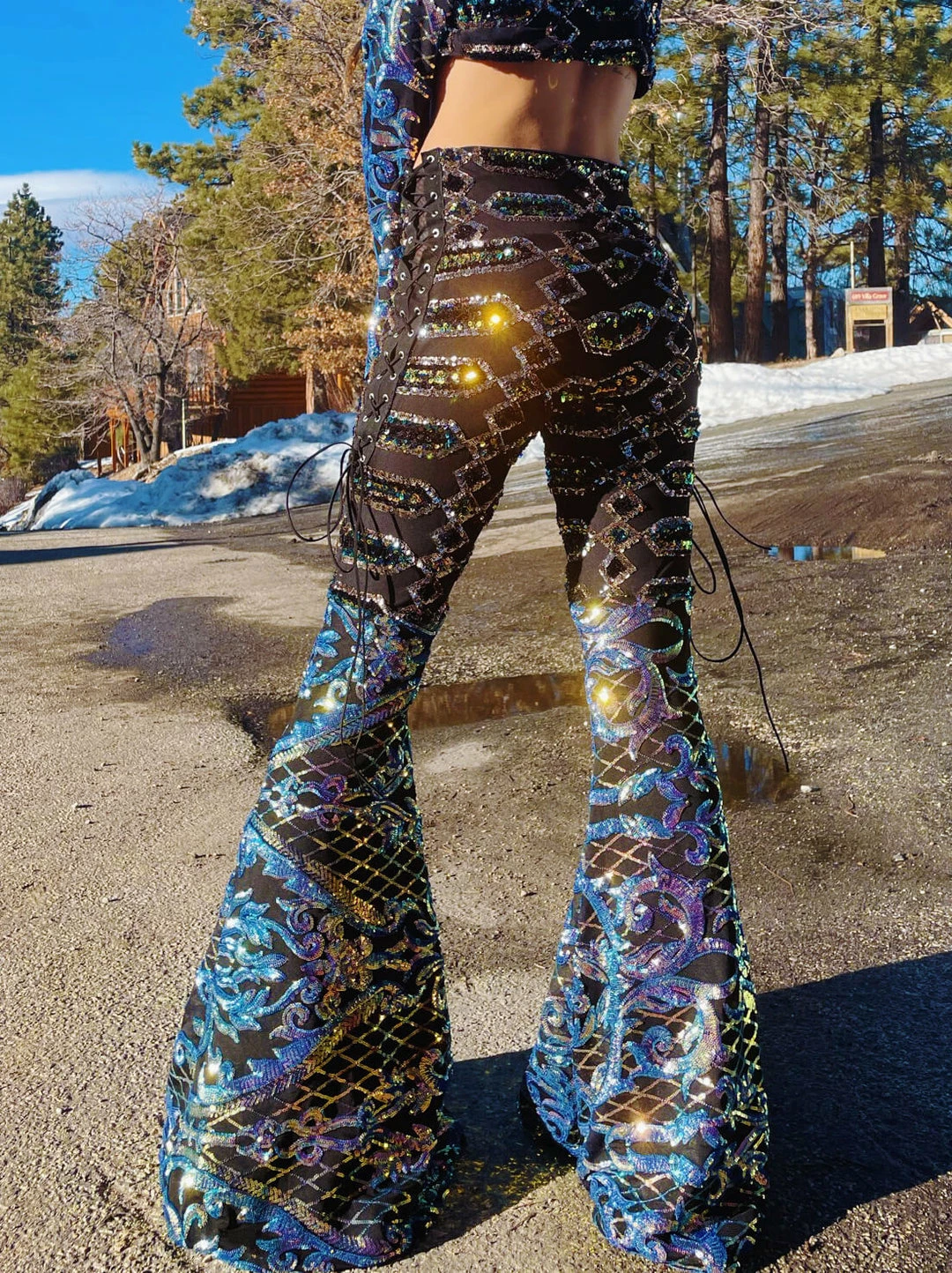 The grooviest sequin bell bottoms of your wildest dreams now exist on this physical plane. These pants are designed with adjustable lace-up hips to hug your curves perfectly. It is also completely lined with high quality helenca fabric so there are absolutely no sequin scratchies!