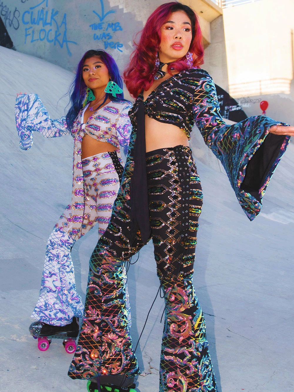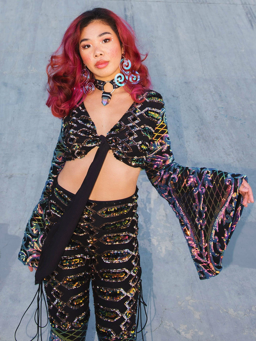 The grooviest, comfiest and most dazzling top to grace your beautiful body (and closet). This top has a relaxed fit with a soft tie in the middle of the bust so it is fully adjustable to your chest. It is also completely lined with high quality helenca fabric so there are absolutely no sequin scratchies!