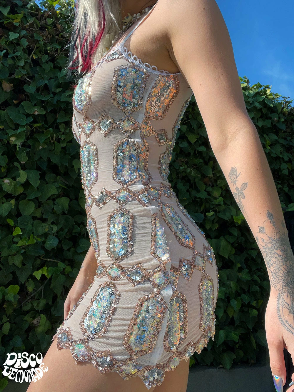 Bodycon white/blue/golden sequin on white 4 way stretch mesh dress. Seams are covered with lace to prevent scratchies! Adjustable bra straps.