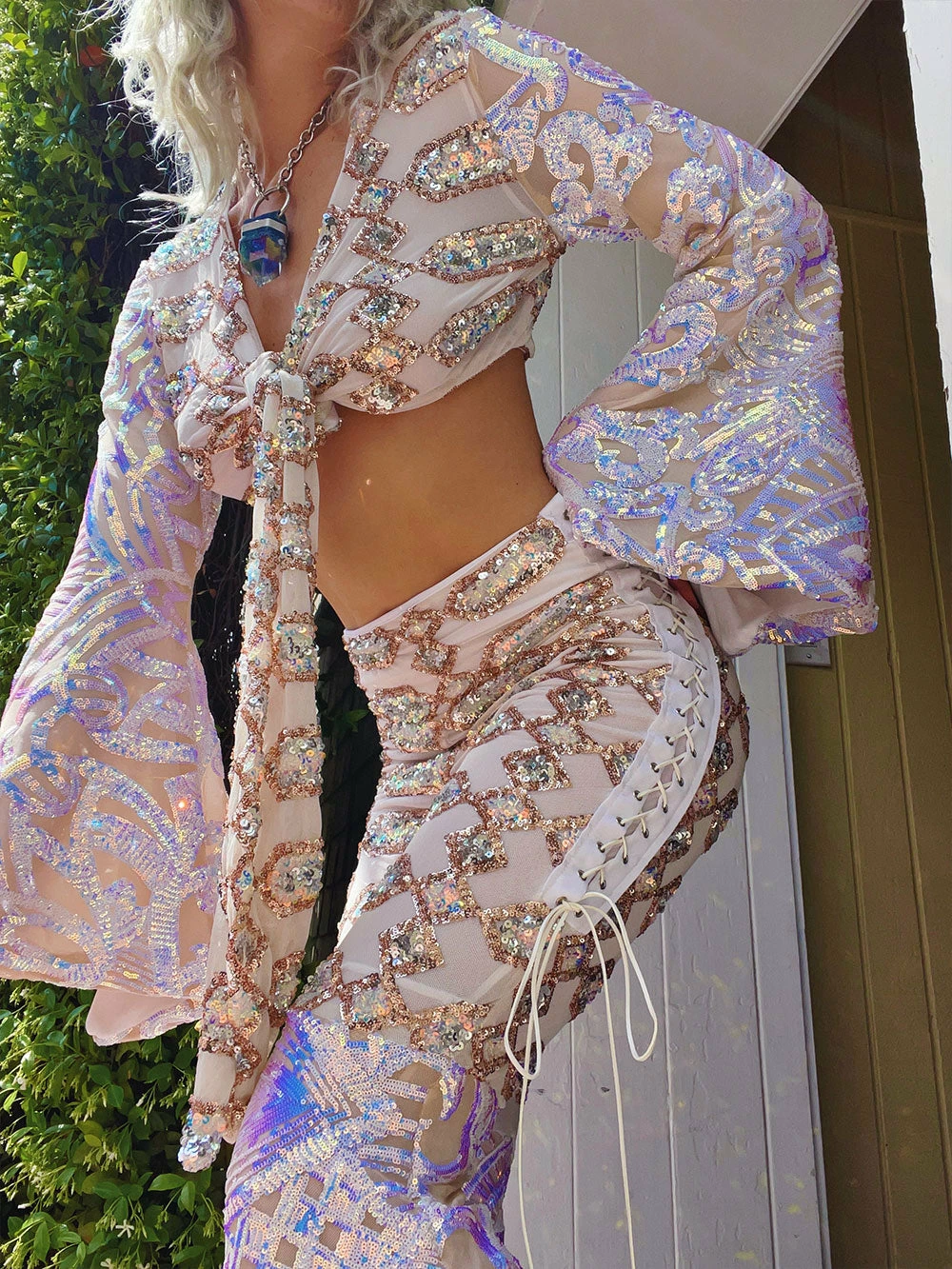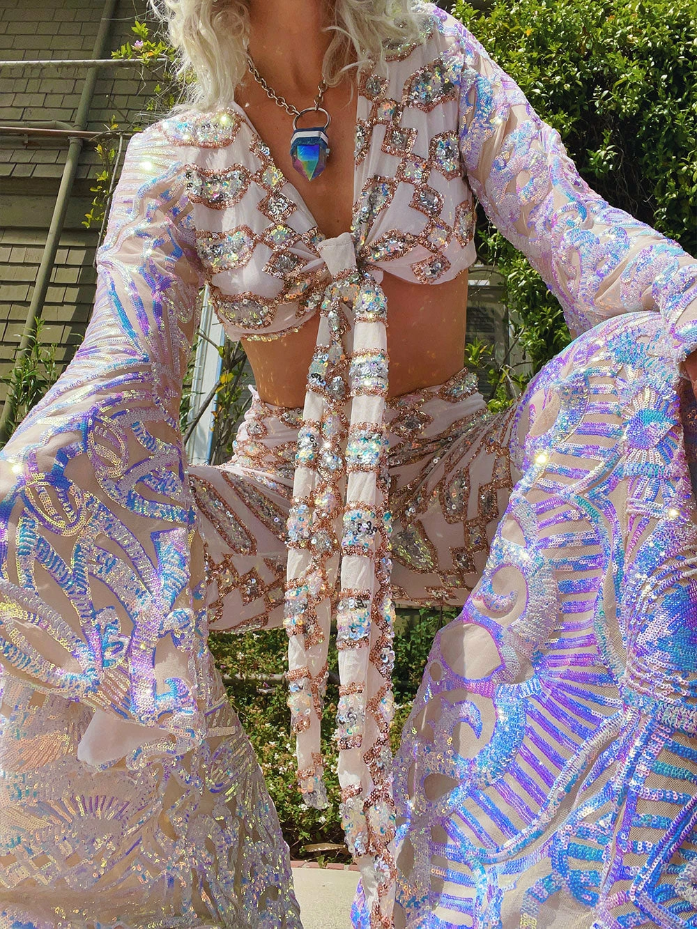 The grooviest, comfiest and most dazzling top to grace your beautiful body (and closet). This top has a relaxed fit with a soft tie in the middle of the bust so it is fully adjustable to your chest. It is also completely lined with high quality helenca fabric so there are absolutely no sequin scratchies!