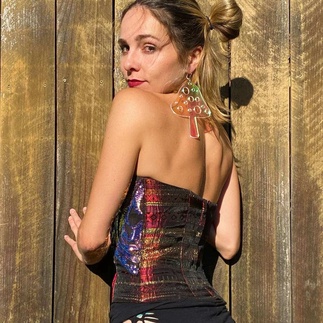 The Majestic Warrior Bustier is a vintage reworked zip up bustier with sparky purples, blues, pinks & golds layered on top of a gorgeous maroon, red & gold base ~ with red butterfly embellishments this is the perfect fairy piece for your next fit!Â