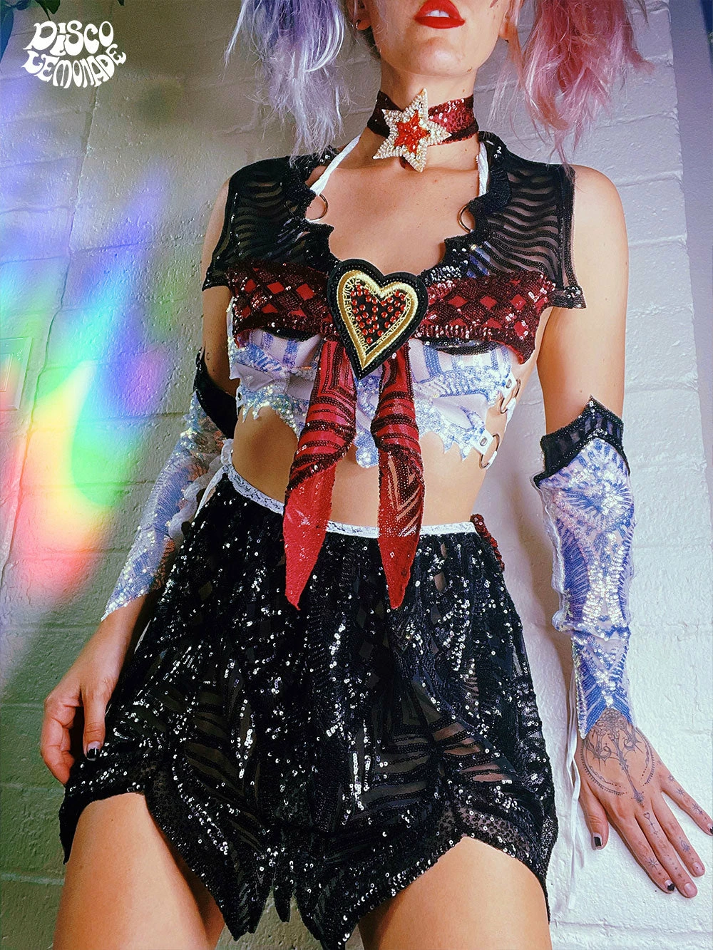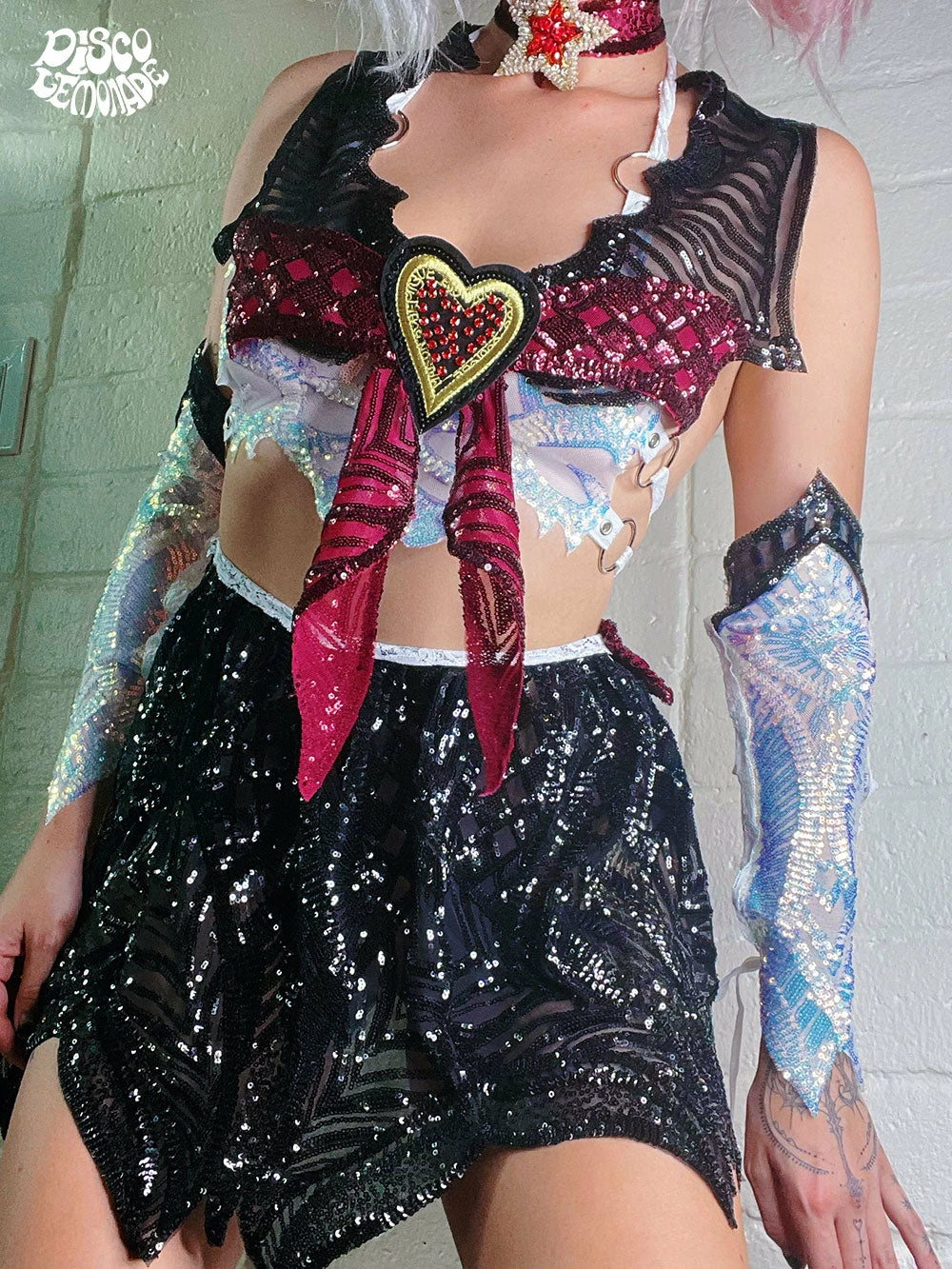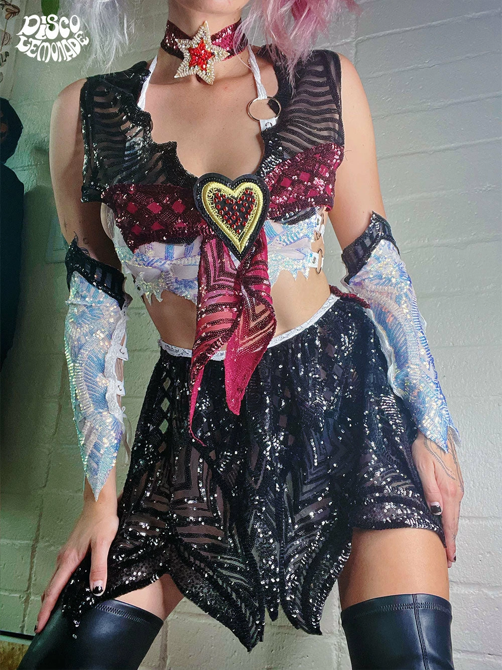 This one of a kind Sailor Pluto outfit comes with the ENTIRE package: lace up arm bands, collar/bow shoulder piece, white top, skater skirt, & star choker.