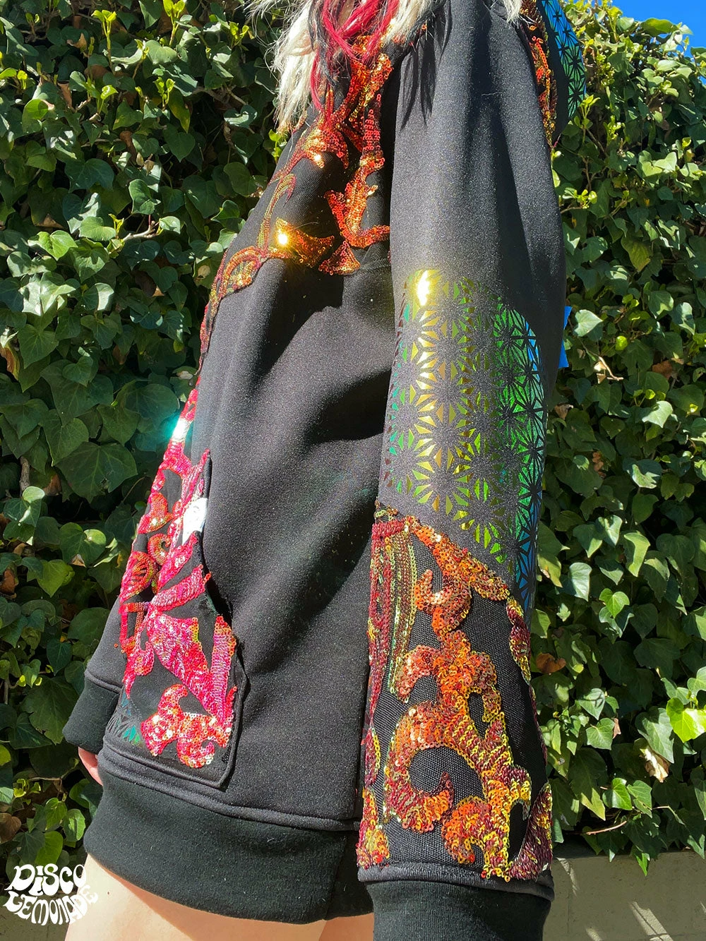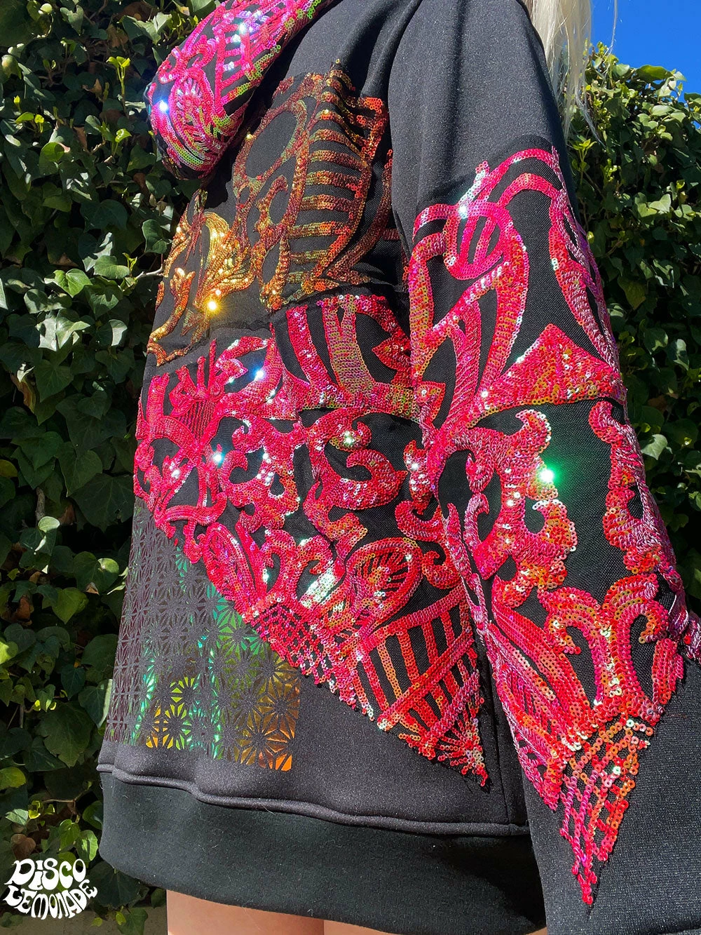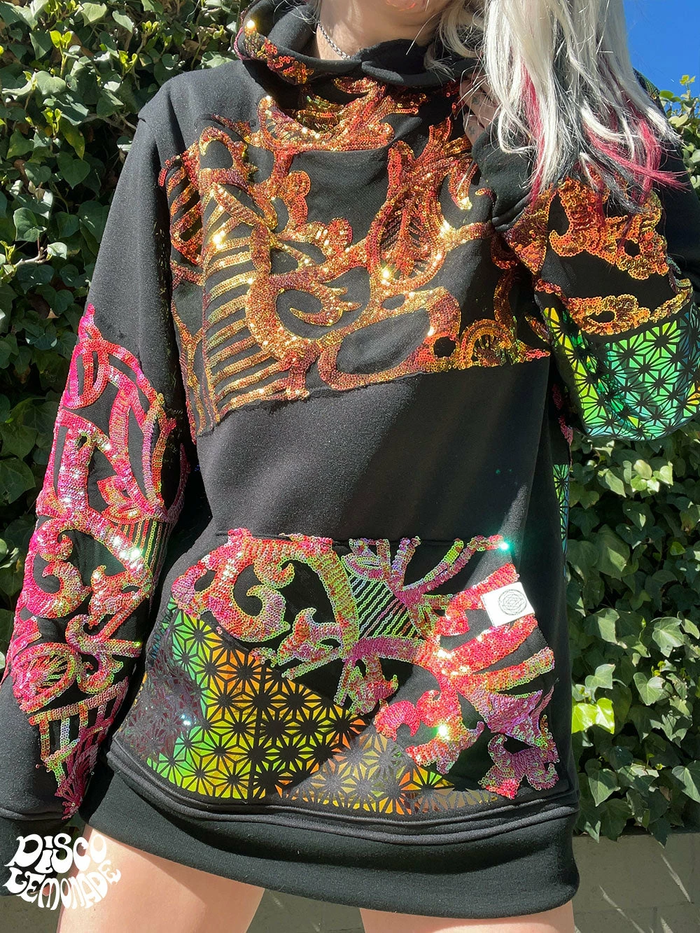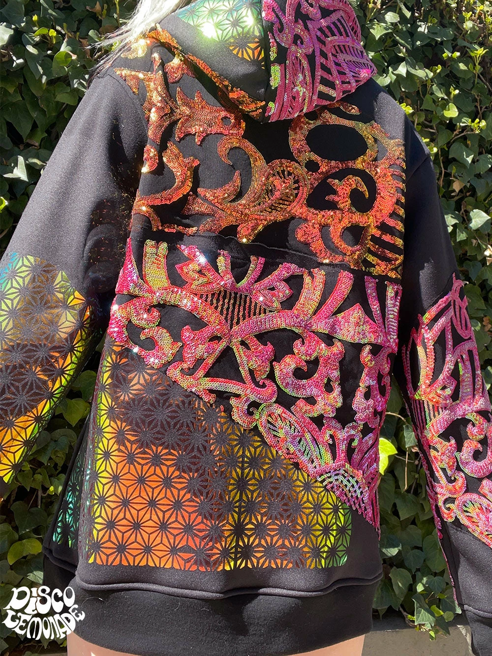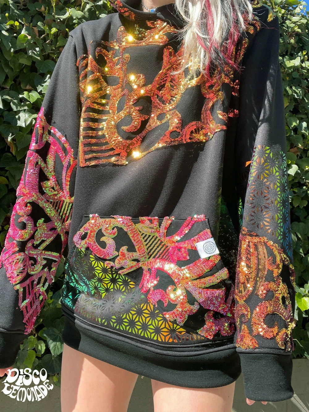 Comfy hoodie with sequin and vinyl detailing.