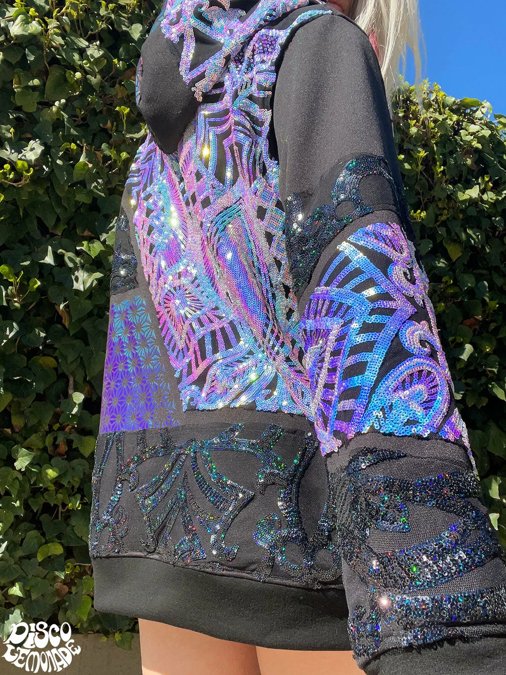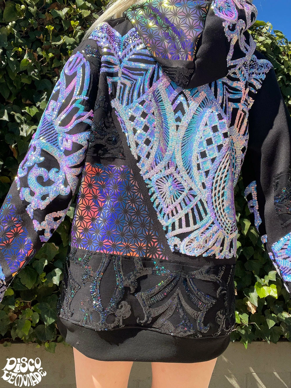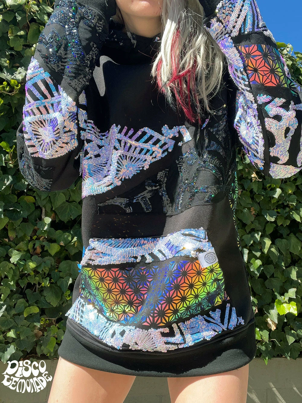 Comfy hoodie with sequin and vinyl detailing.