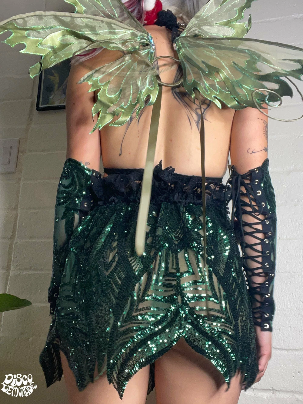 Giant mushroom embroidery top laced up with o rings & a forest green sequin on 4 way stretch mesh skater skirt with ruffle waist band & slit bow closure & matching fairy cuffs.