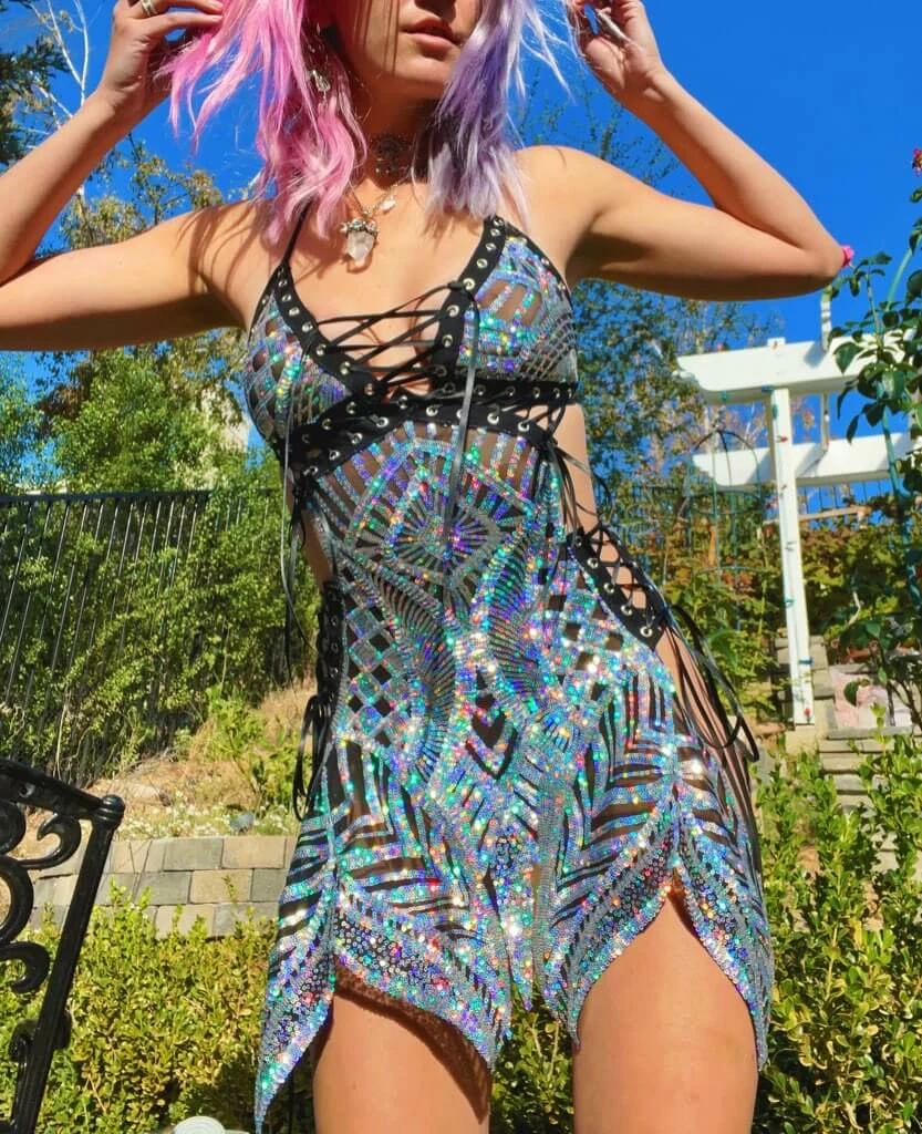 Silver sequin shining rainbow iridescence is the afterhours move. Lace up ties make this piece super adjustable.