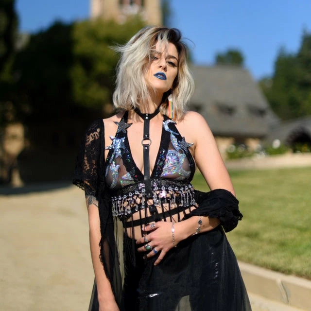 Inspired by the infinite galaxies in our universe, the Space Punk Disco Top is OUT of this world ・:*:・゚☆ Silver iridescent sparkles shine all the colors of the rainbow, with silver star and moon ascents on the bra top, this piece is dynamic & perfect for your next night out. Layers of beading & trim add a whimsical touch to the unique, intergalactic Disco piece.