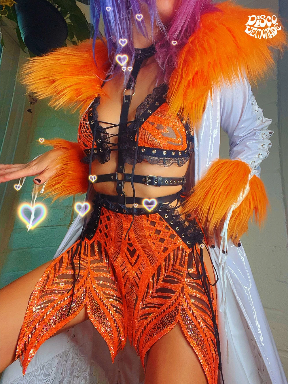 Iridescent orange sequin on black four way stretch mesh Disco Skirt with black lace up grommets and lace detailing for a comfortable, adjustable fit.Â