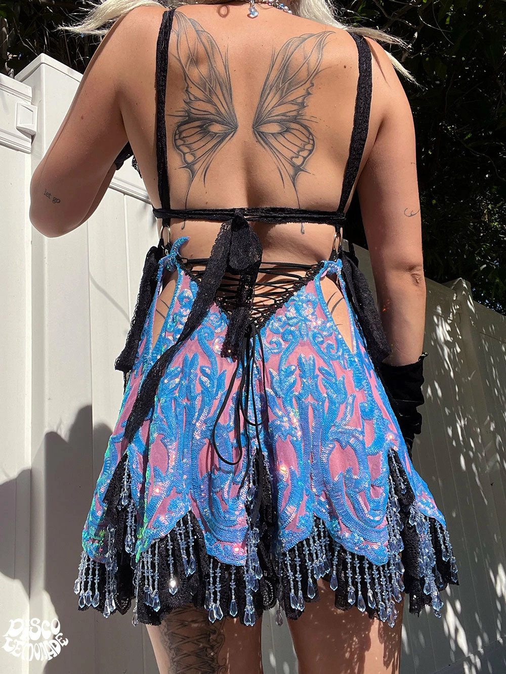 Blue irredescent swirl dress on 4 way stretch pink mesh with gorgeous peekaboo cut outs, black lace up accents, beaded fringe & lace detailing on the hemline.