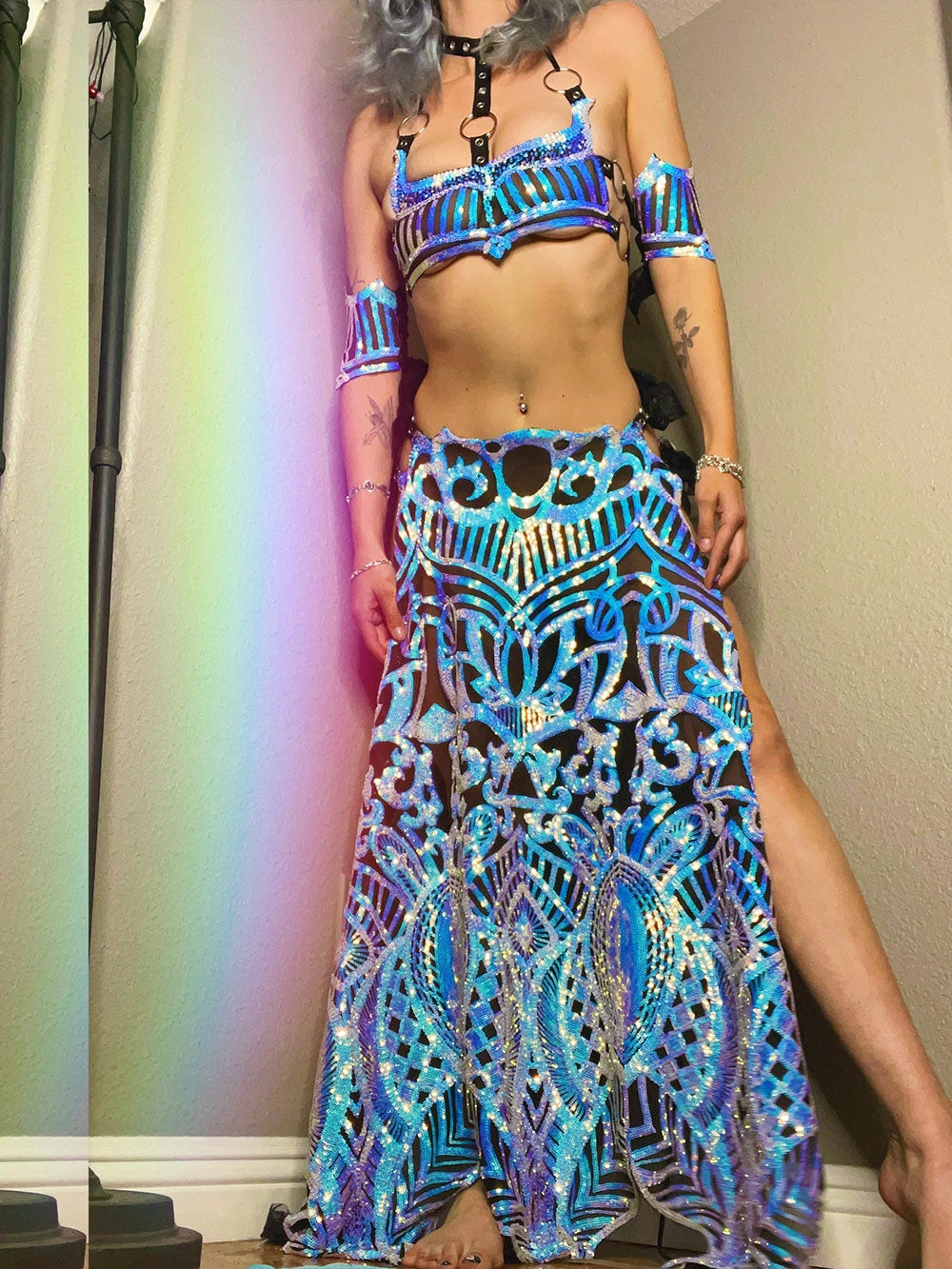 This one of a kind Disco Set was inspired by the Goddess herself, CHER. The Fairy Warrior Disco Skirt has now been made into a maxi! Woo! The maxi skirt sits on your hips and has slits along both sides with adjustable lace up bow closures. The top has o ring attachments & a connected grommet choker. The Set comes with a maxi skirt, top, & fairy arm bands.