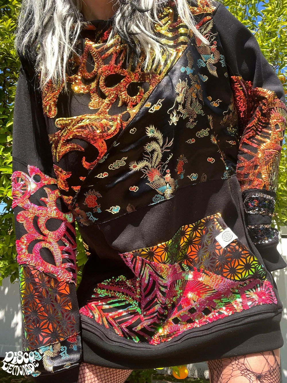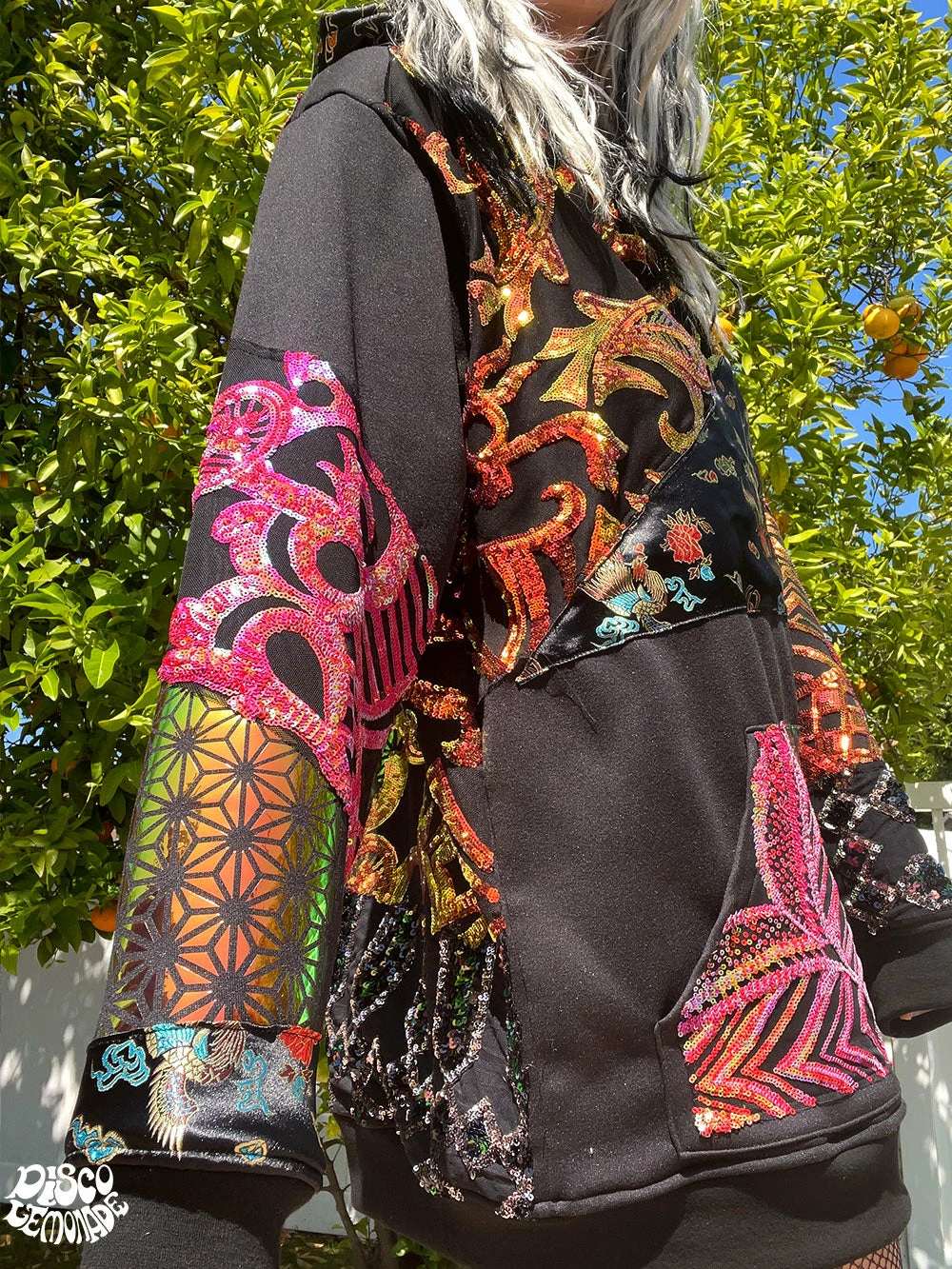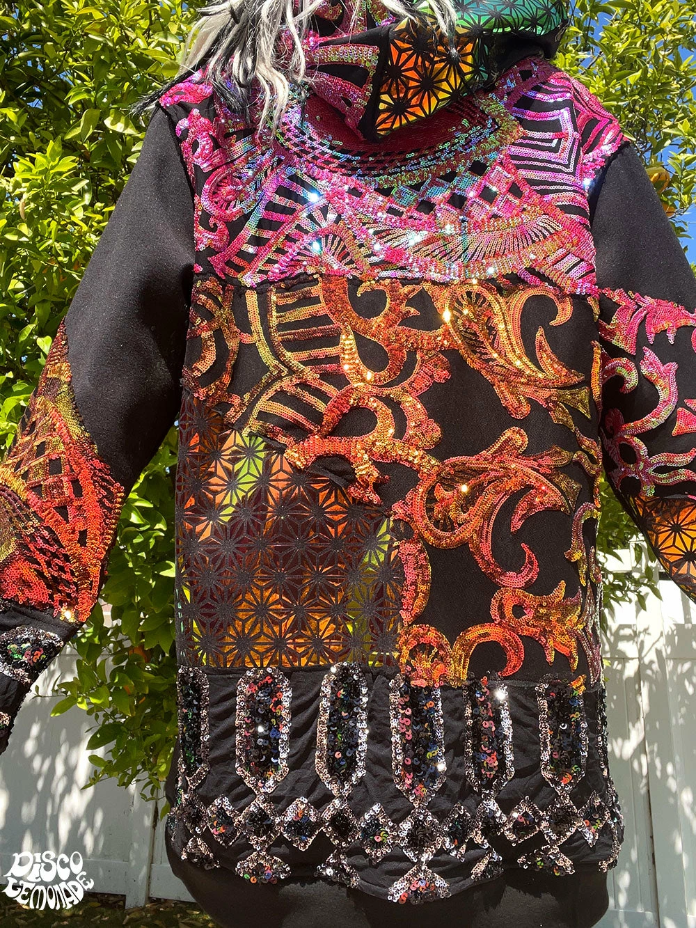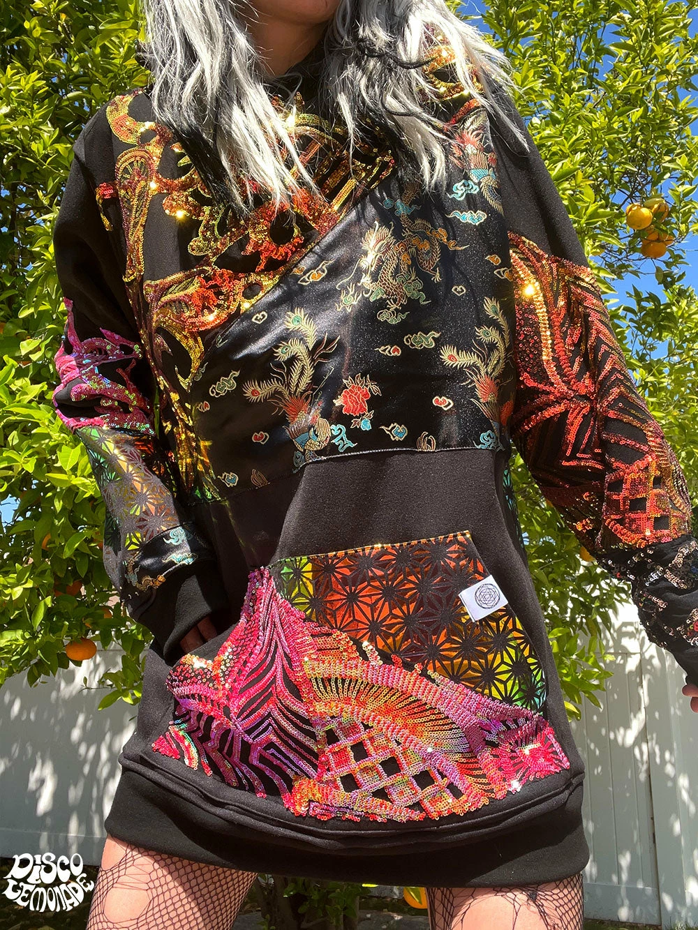 Comfy hoodie with sequin, brocade & vinyl detailing.
