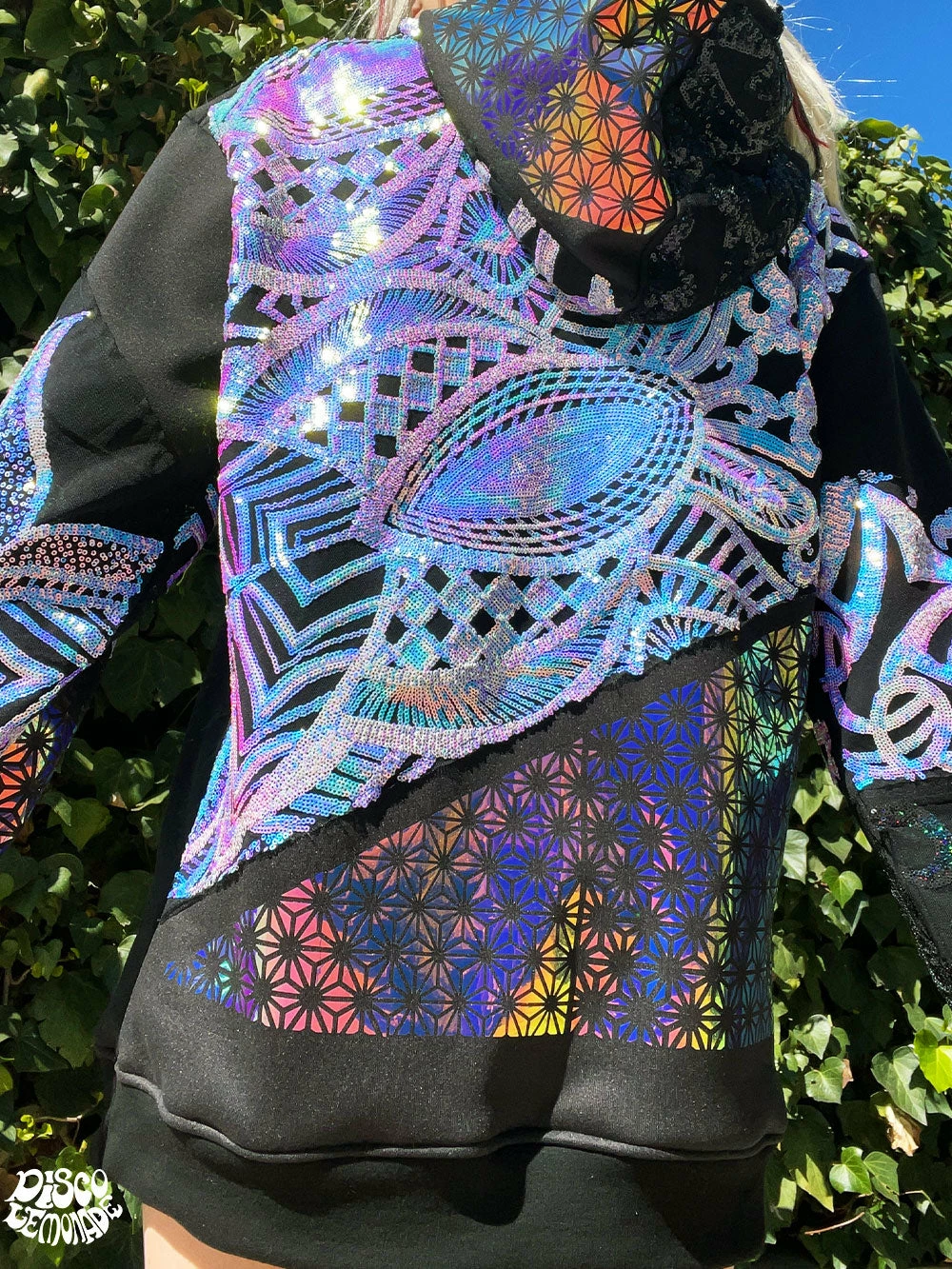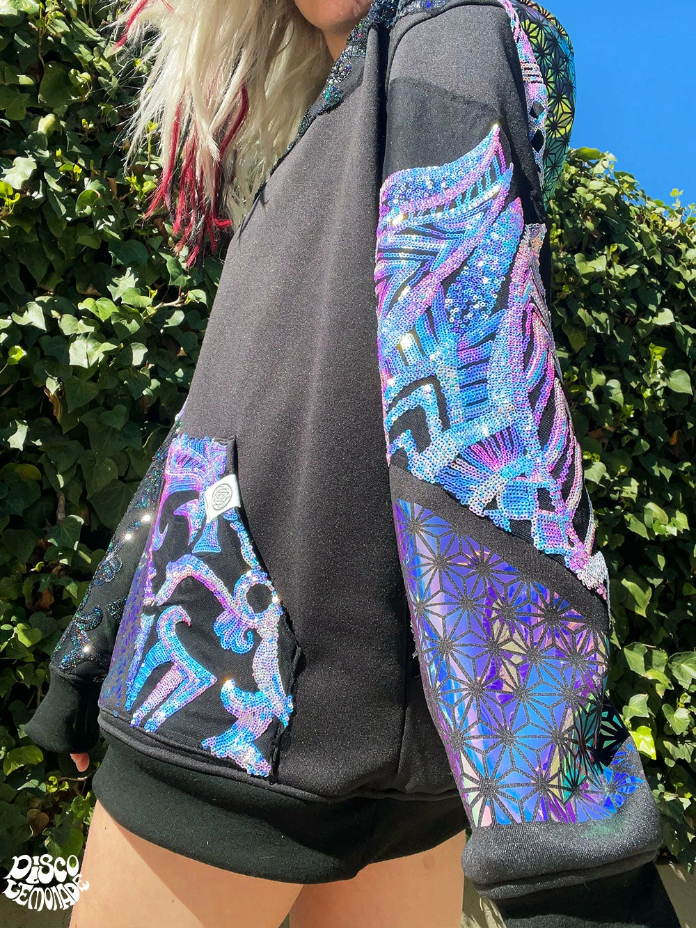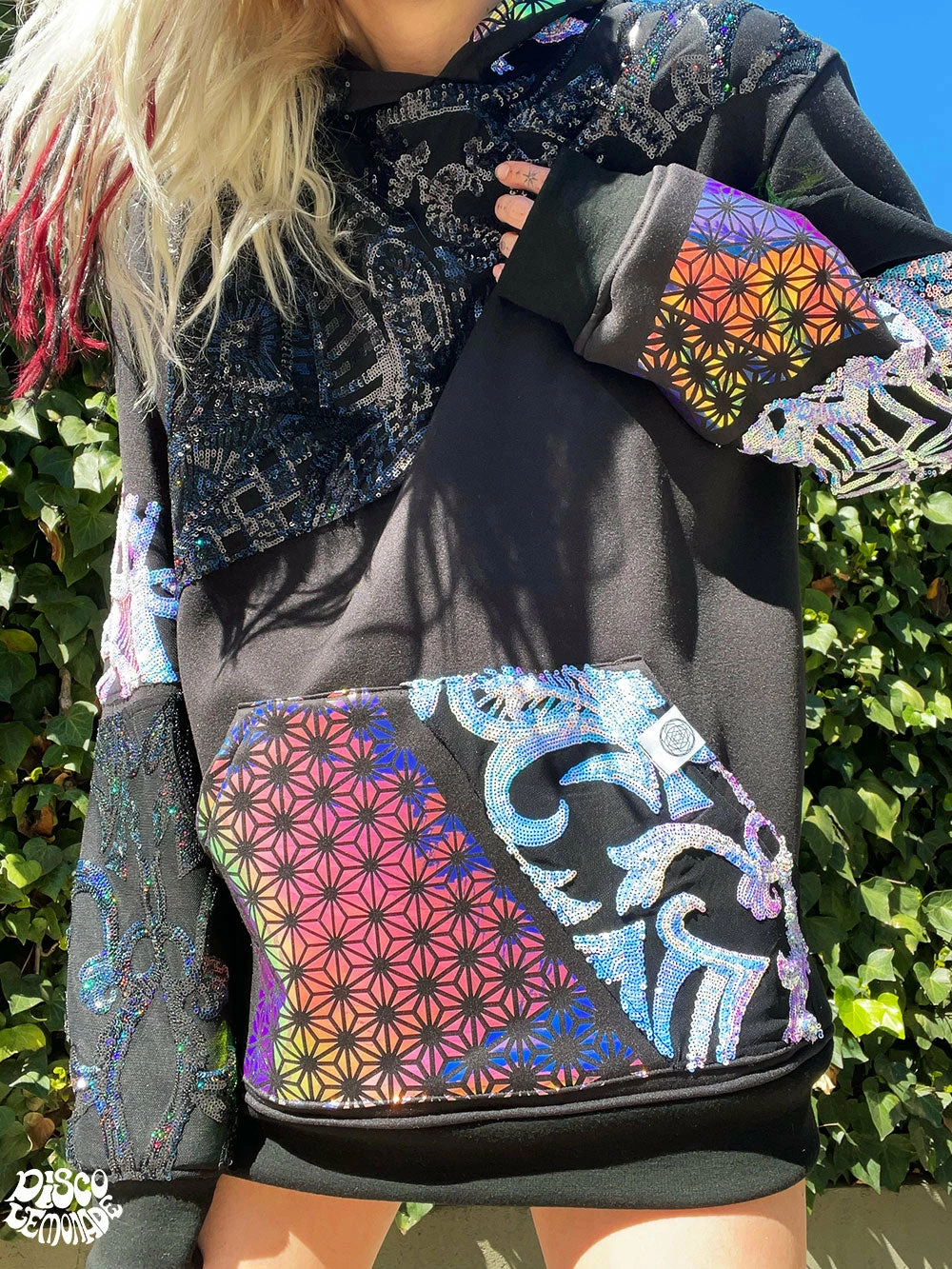 Comfy hoodie with sequin and vinyl detailing.