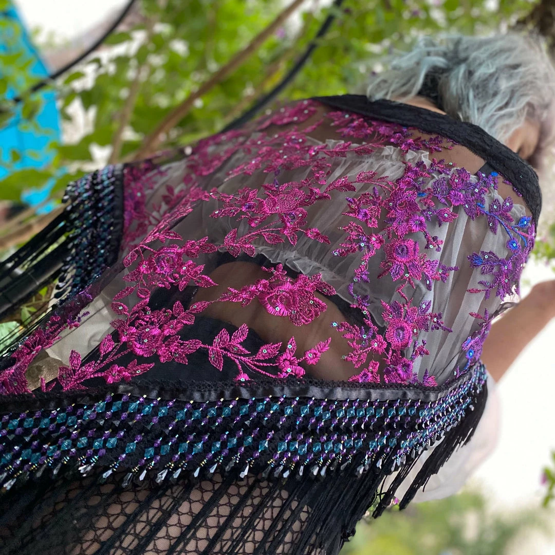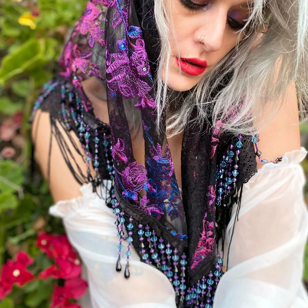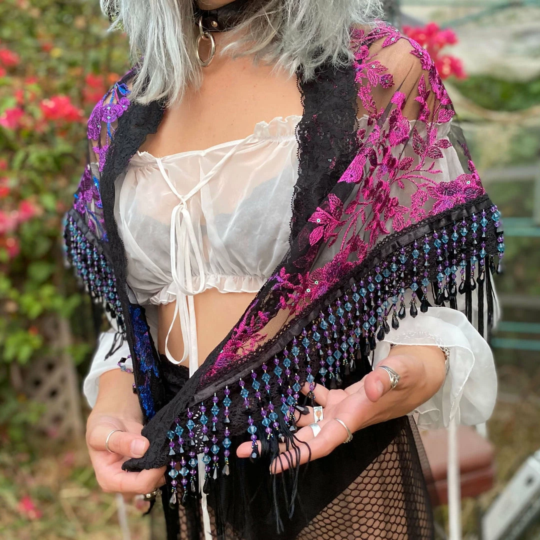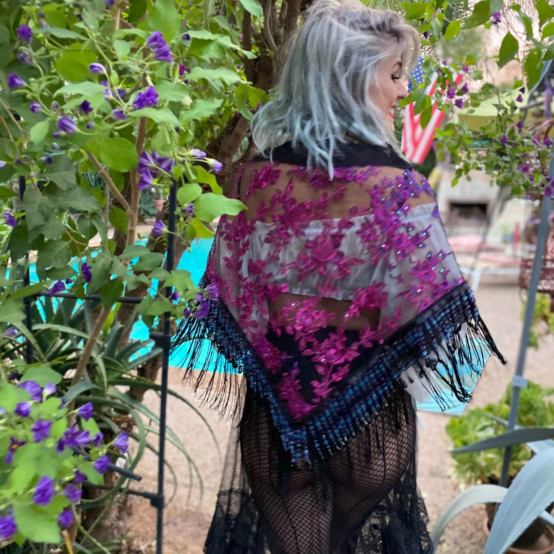 Embroidered magenta to blue Goddess Shawl ~ with black fringe, black lace & turquoise, purple & blue beading ~