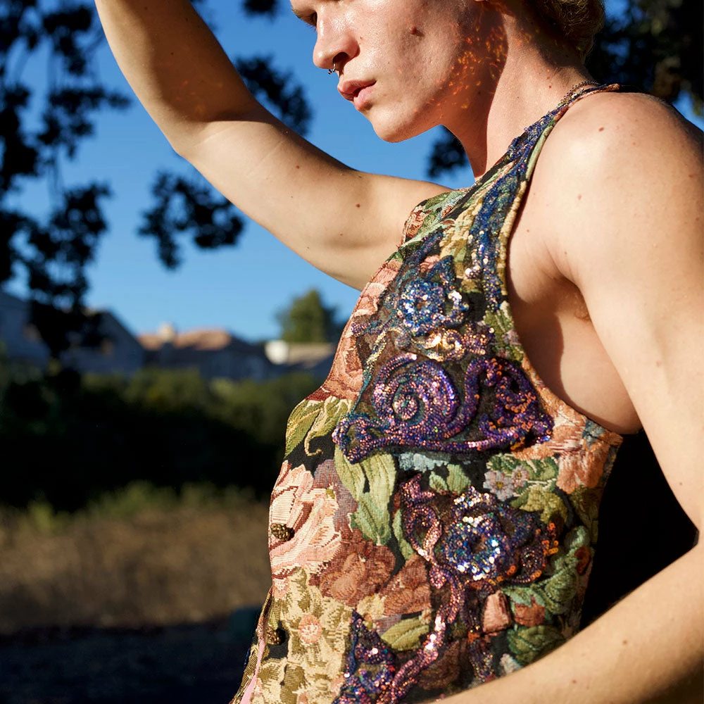 Vintage upholstery floral vest with iridescent purple sequin detailing & beading along the hem ~ adjustable tie in back, 3 button closure in front