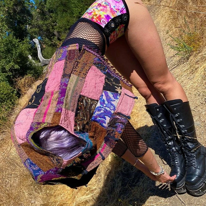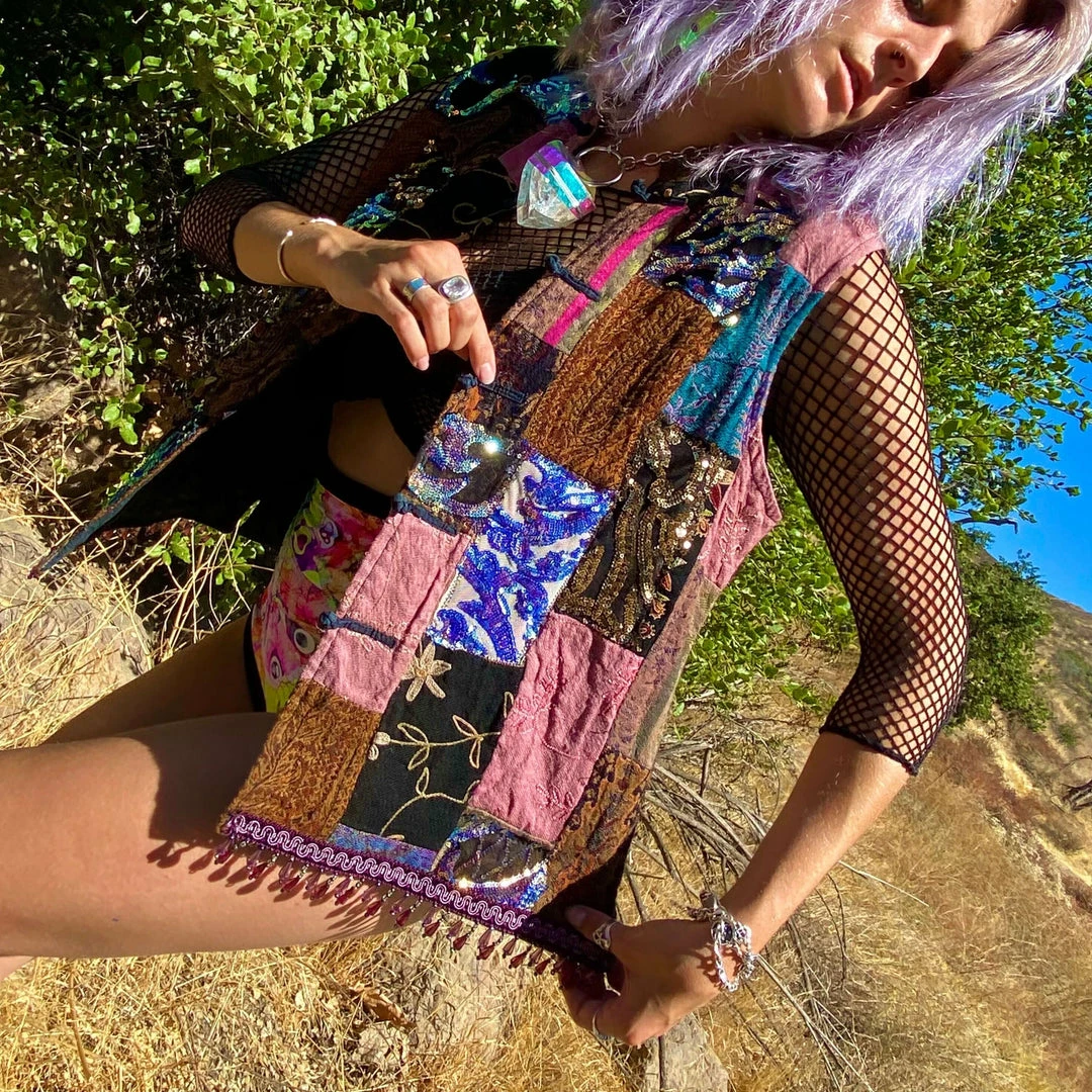Vintage reworked patchwork vest with sequin detailing and purple beading along hem