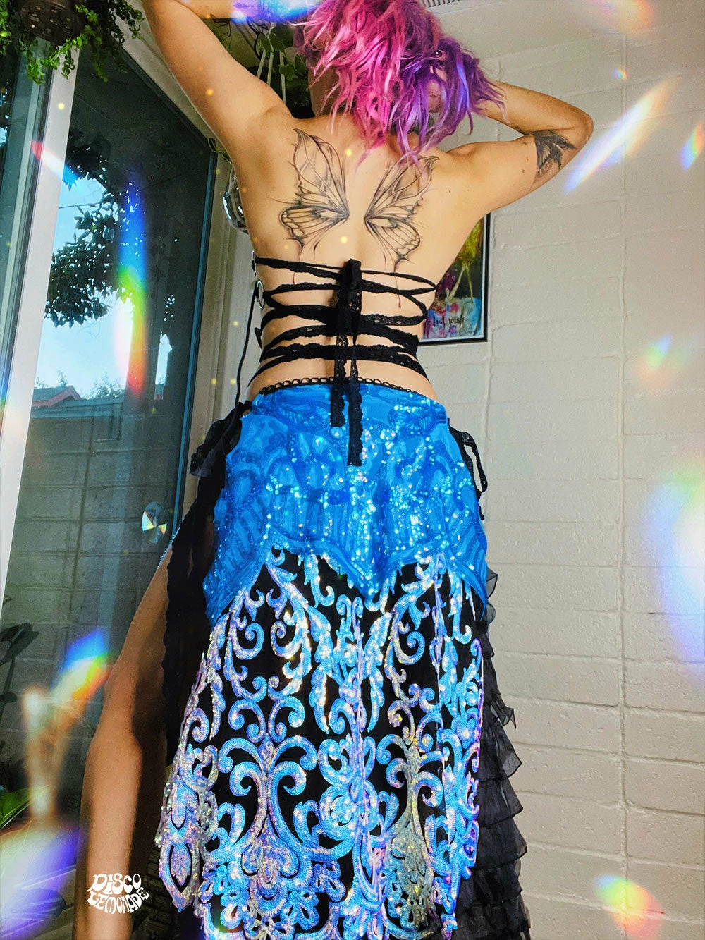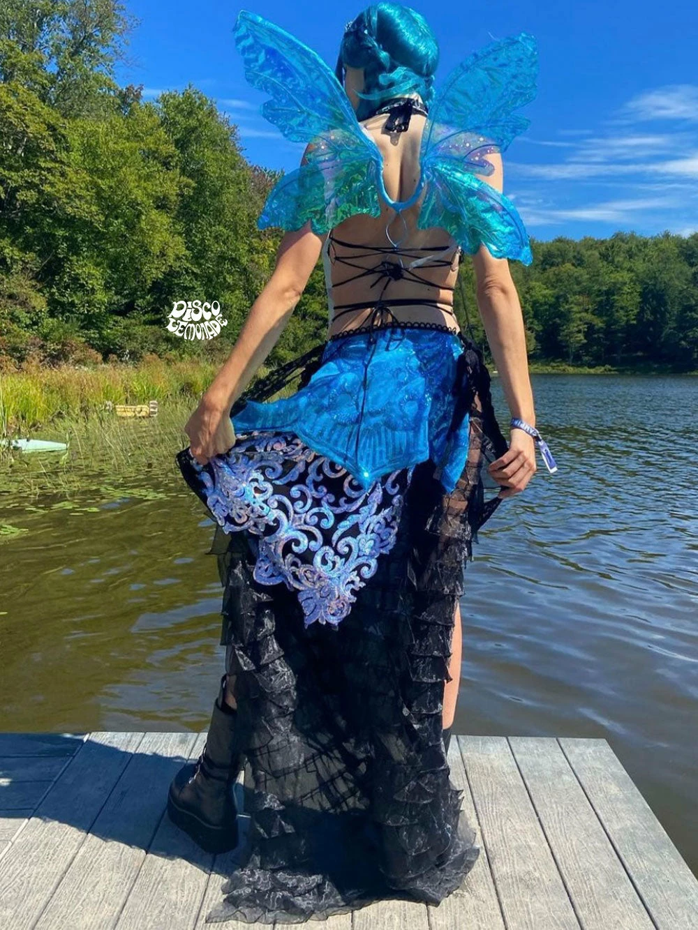 Water moon is inspired by Pisces energy. Blue iridescent hardware Disco Dress with skirt train (detachable) and gorgeous beaded embellishments & butterflies.
