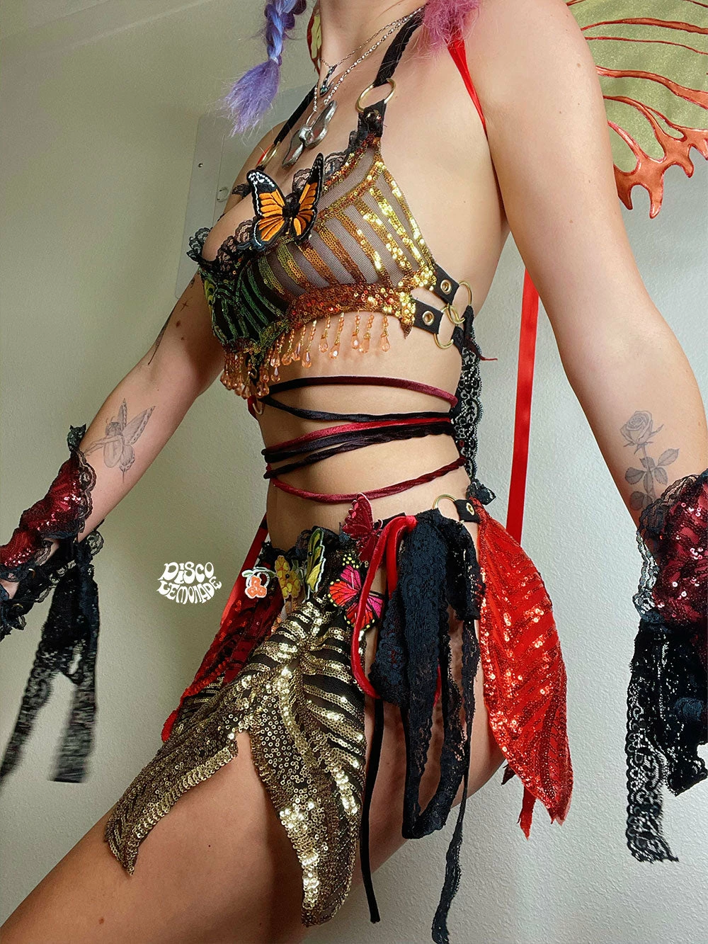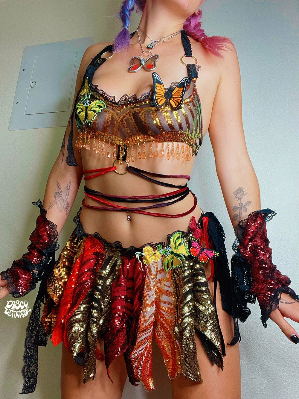 Flame vibes as fuck. Full patchwork twirly fairy skirt that ties on the side with a matching butterfly top & butterfly embellishments & matching fairy cuffs.