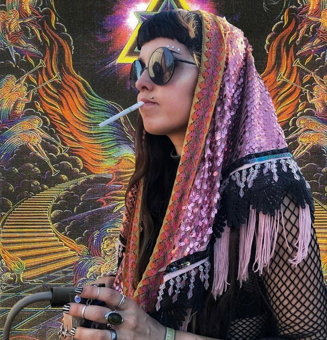 Glistenin’ in pink, the Rose Quartz Goddess Shawl is where it all began ~ The Original Goddess Shawl made it’s first appearance at Lightning in a Bottle 2013 & has been guest list ever since. An overall favorite, the Rose Quartz Goddess Shawl radiates Rose Quartz vibeZZ & is going to draw sum attention to your sexy self as you move that booty on the dancefloor!