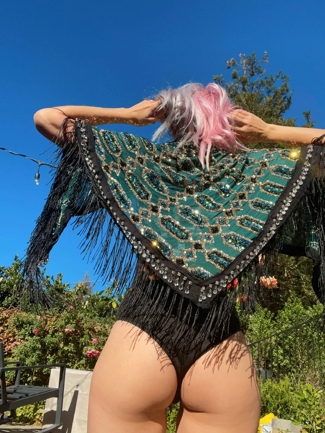 Emerald green fabric with gold and blue iridescent diamond geod shapes along the fabric with black fringe, lace & beading detailing.